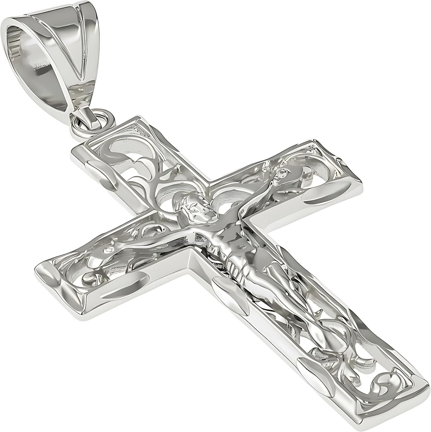 This stunning filigree crucifix cross necklace features exceptional craftsmanship with up to 10 times more 24 karat real gold plating than standard electroplated fashion jewelry. The intricately designed Jesus pendant measures 1 3/8 inches by 2 inches and includes a 3/4 inch bale for secure attachment. Available with or without a 20-inch long, 3mm curb link chain, this piece offers versatility in styling. Choose between yellow gold or white gold rhodium finish to match your personal preference. The necklace arrives in an elegant black velvet pouch, making it ready for gifting. Manufactured in the USA since 1987, this cross pendant provides an affordable alternative to solid gold jewelry while maintaining a luxurious appearance. The substantial gold plating ensures durability and long-lasting shine. This religious jewelry piece is suitable for both men and women who appreciate fine details and quality construction. The filigree design adds an artistic touch to the traditional crucifix, creating a timeless accessory that can be worn daily or for special occasions.